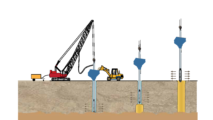 İstenen derinliğe inildikten sonra ya da boru itme aşamasındayken kovaya çakıl doldurulur. Boru yukarı çekildiğinde, borunun alt kapağı açılarak çakıl akışı başlar. Yukarı aşağı hareketler ile çakıl zemin içinde yatay olarak sıkıştırılır ve istenilen çapa ulaşana kadar işlem devam ettirilir. Bu işlem kolon boyunca yukarı doğru devam ettirilir. Kovaya çakıl ilavesi sürekli olarak yapılabilir. İstenilen çap oluşturulduğu, kalite kontrol ve kullanılan çakıl miktarı dikkate alınarak kontrol edilir. Boru çapından dolayı çap oluşma problemleri minumumdadır.